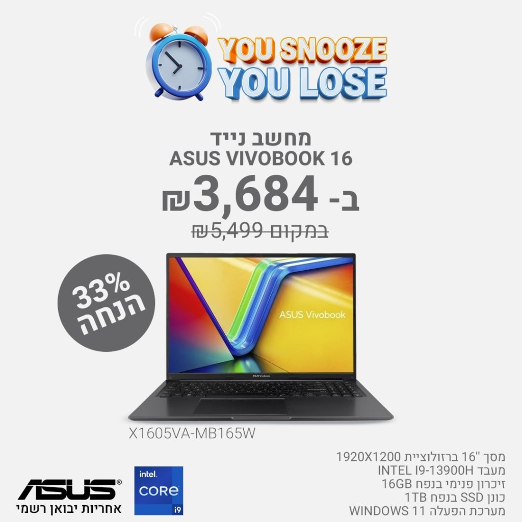 מסך 16 אינץ' IPS ברזולוציית WUXGA (1920×1200), מעבד intel I9-13900H דור 13, זיכרון פנימי בנפח 16GB וכונן SSD M.2 NVMe בנפח 1TB עם Windows 11 מותקן מראש!