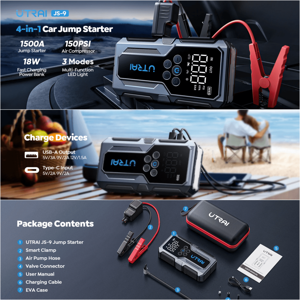 מדובר על בוסטר התנעה הכי חדש של חברת UTRAI אשר מתאים להתנעת רכבי בנזין עד 6,000 סמ"ק ודיזל עד 4,500 סמ"ק (זה רובנו) כולל משאבה לניפוח צמיגים אשר תספר לכם עד 150PSI שזה מה שכולנו צריכים!